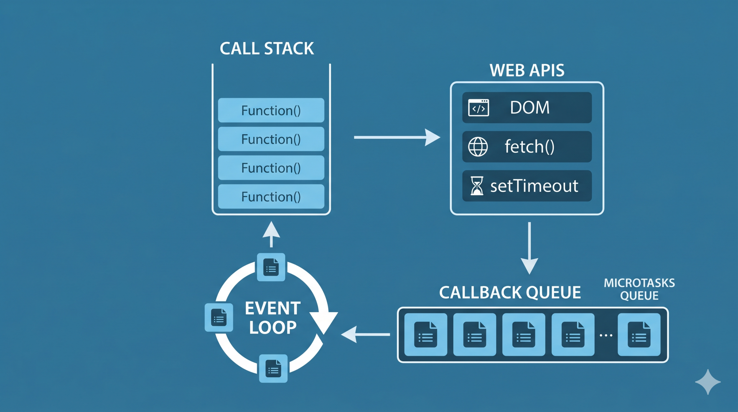 Quando você pede para o navegador carregar uma imagem, o JS não fica parado esperando. Ele joga essa tarefa para as Web APIs. Quando a imagem termina de carregar, a tarefa vai para a Callback Queue. O Event Loop é o guarda de trânsito que olha para a Call Stack: se ela estiver vazia, ele pega a primeira tarefa da fila e coloca para executar.