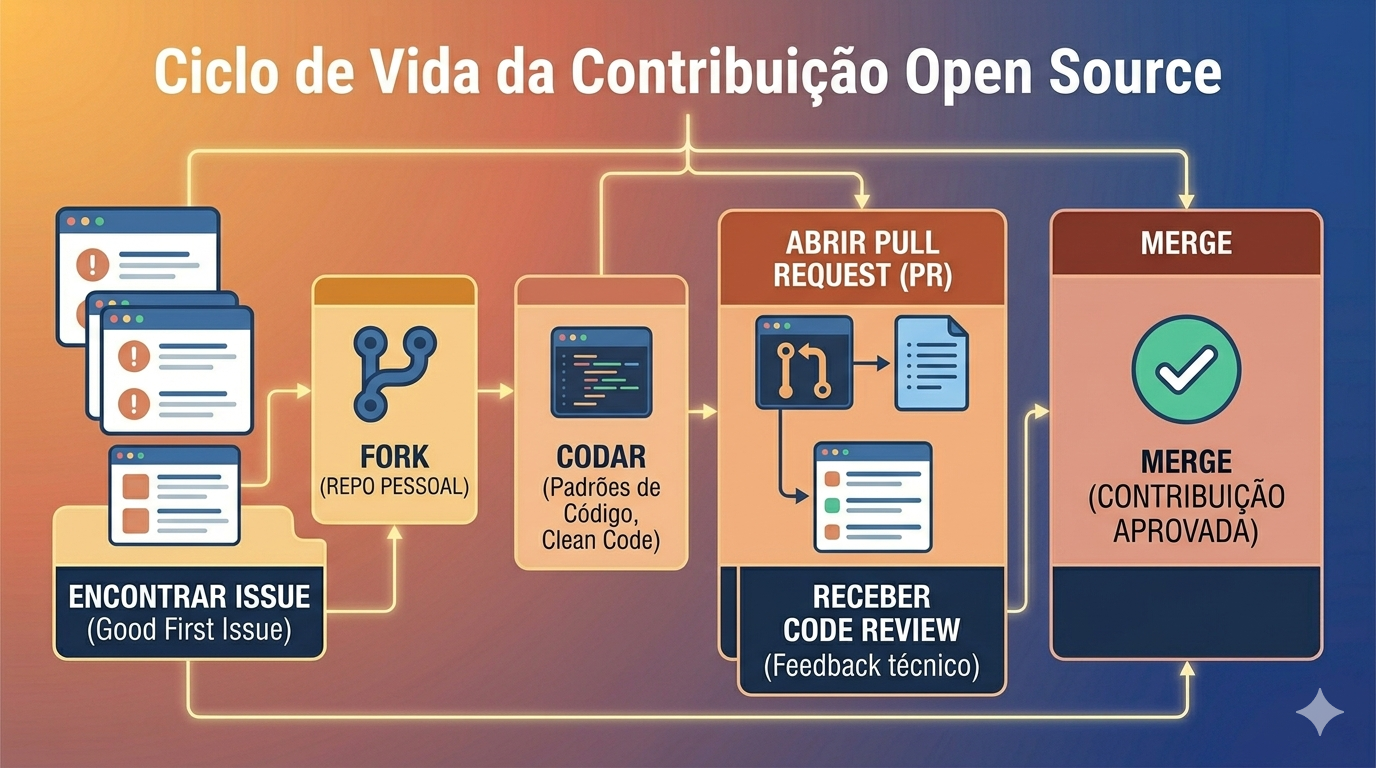 Visibilidade: Seu código fica público e associado ao seu nome. Recrutadores amam ver que você tem commits em projetos conhecidos.